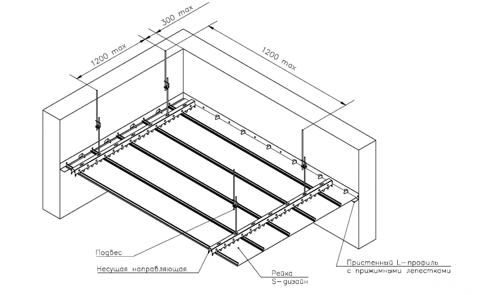Направляющие можно крепить непосредственно к потолочному перекрытию или использовать для этого пружинные подвесы и/или миниподвесы. В конструкции направляющей предусмотрены специальные замки, в которые защелкиваются декоративные панели (рейки). Конструкция замков обеспечивает возможность быстрого демонтажа декоративных панелей без ущерба для них.