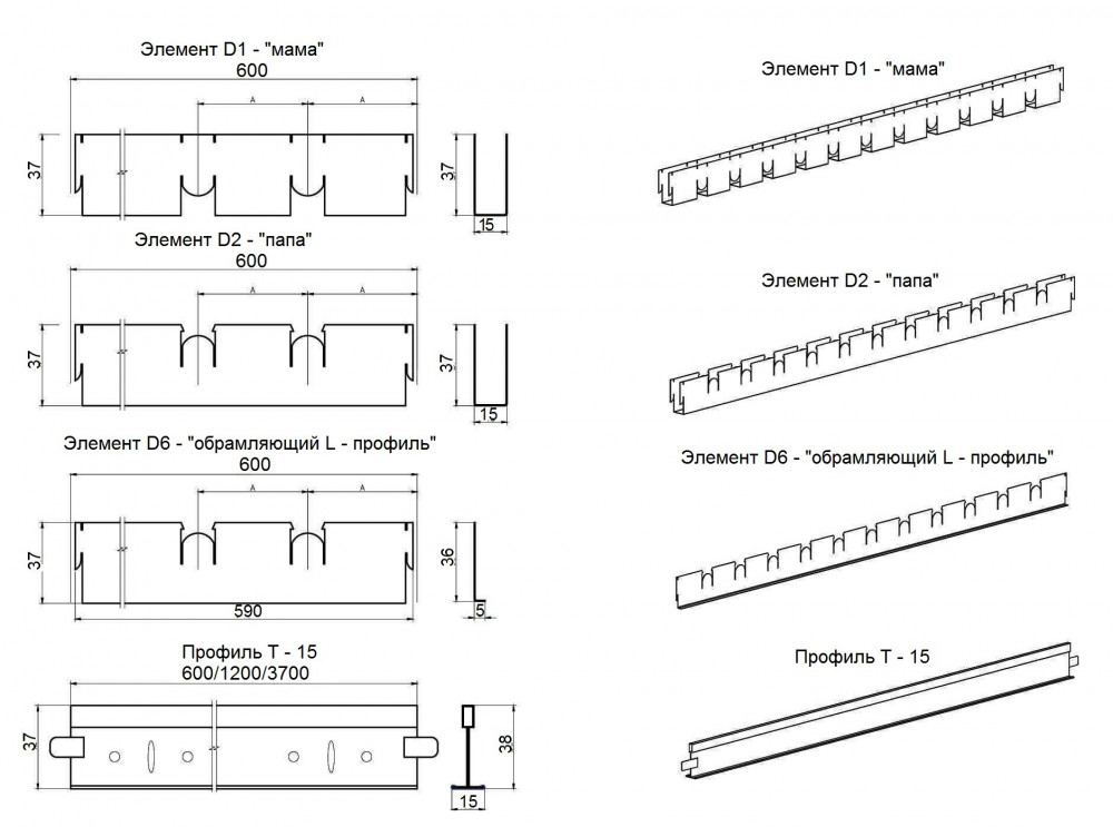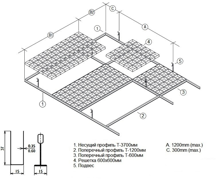 Cистема Грильято CL-T15 состоит из отдельных объемных решеток и подвесной системы «Т-профиль» шириной 15 мм. Объемные решетки образованны пересекающимися U-образными профилями. По периметру решетка обрамлена L-образными профилями. Каждая отдельная решетка легко вставляется в стандартную ячейку подвесной системы Т-15. По завершению установки решеток на подвесную систему трудно визуально отличить Т-профили подвесной системы от U-образхных профилей Грильято, т.е. поверхность производит впечатление сплошной (непрерывной) конструкции.