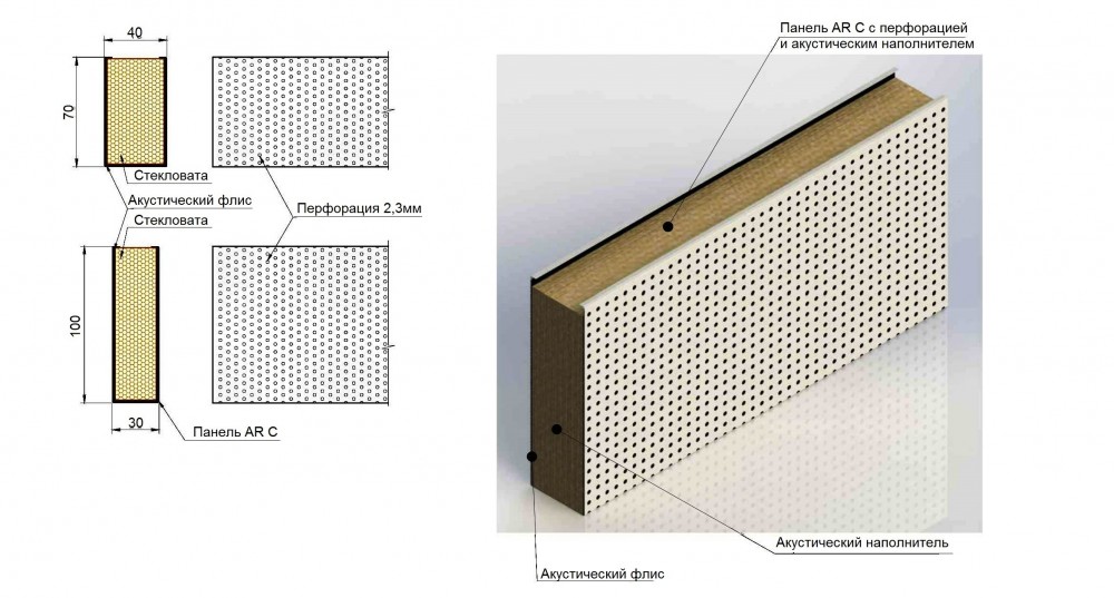 Для того чтобы обеспечить оптимальный акустический контроль в помещениях, рейки могут быть перфорированными. . В качестве стандартной функции, перфорированные панели снабжены звукопоглощающим нетканым материалом наклеенным на внутренней поверхности панели и заполнены минераловатой.